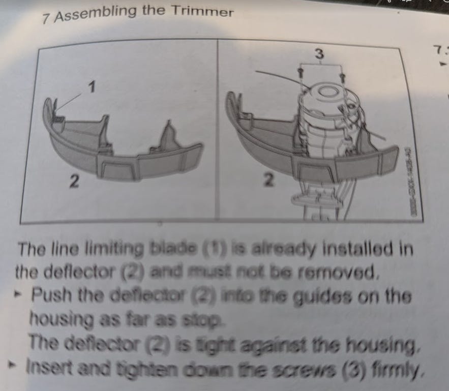For those still with me, I gave up on the strimmer. I had a go at it, I really did. I couldn’t get beyond this, which was the first part of the whole process, racingly entitled “Mounting The Deflector”.