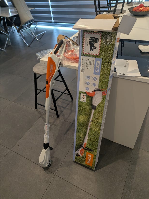 And, lo, I present the strimmer. Cordless, thankfully. The last corded thing I wielded in the garden was a hedge trimmer thing, rendered impotent the moment I accidentally trimmed the cord in two